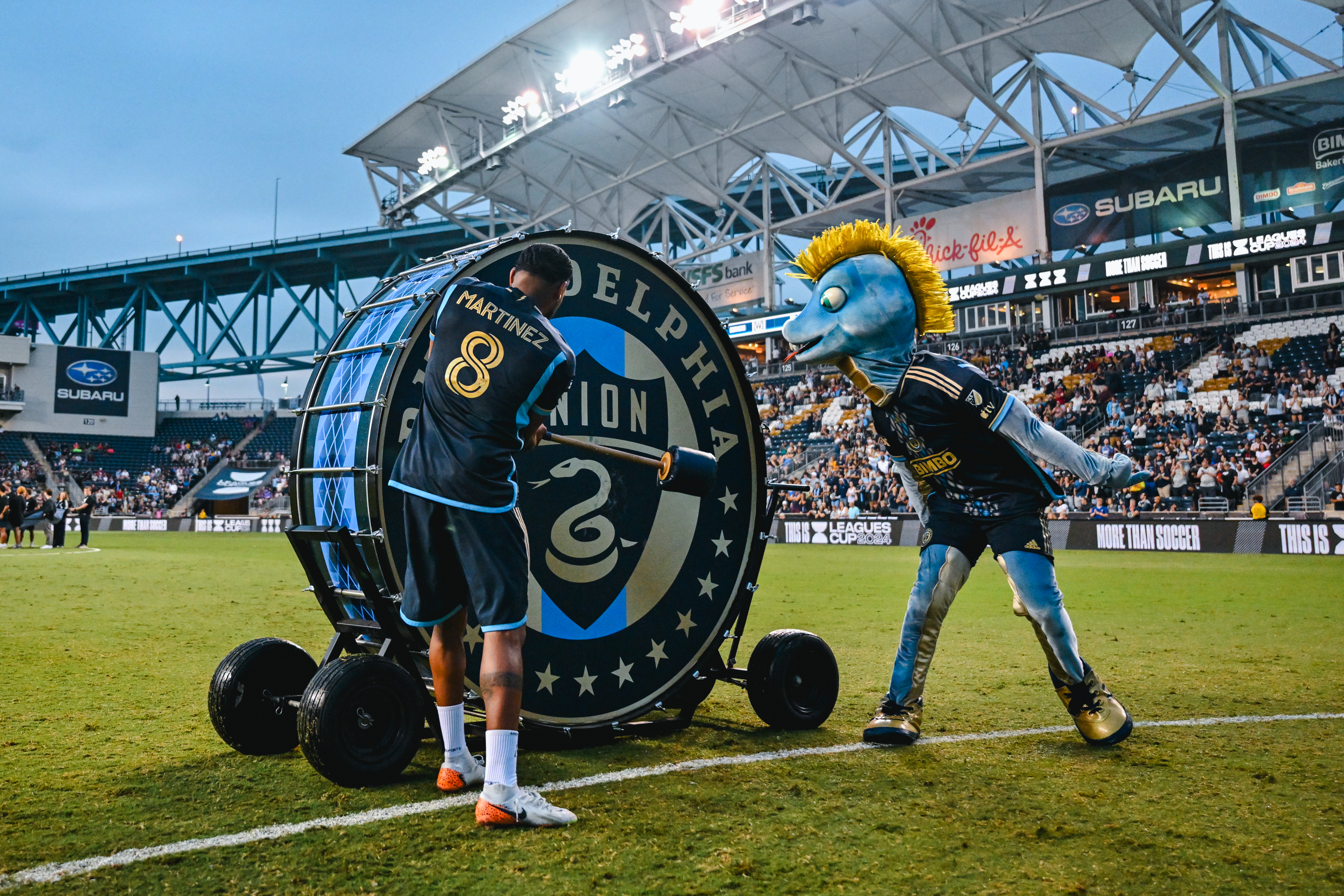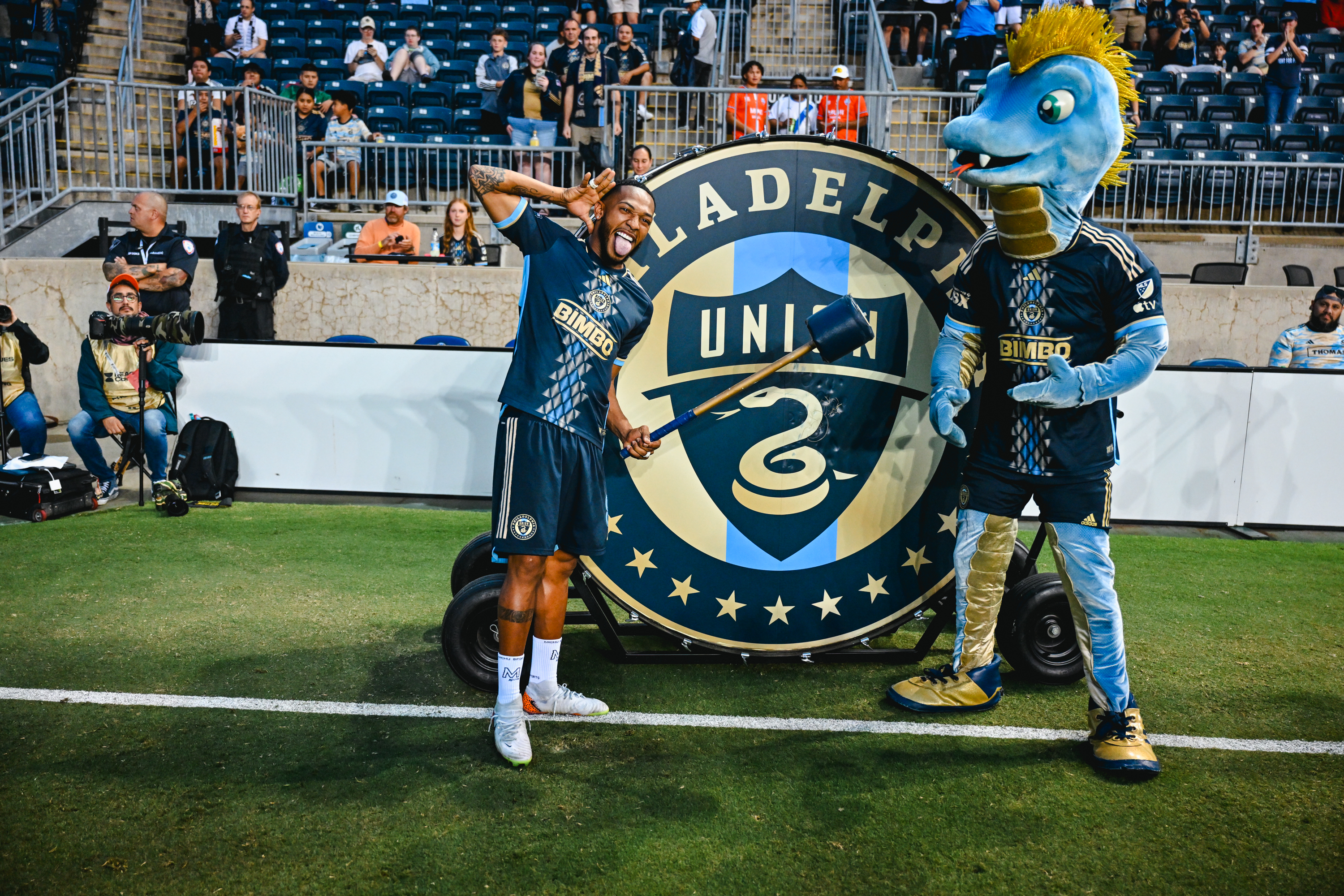 José Martínez strikes the drum and salutes the crowd, and the starting XI for the Union. Photo credit: Philadelphia Union